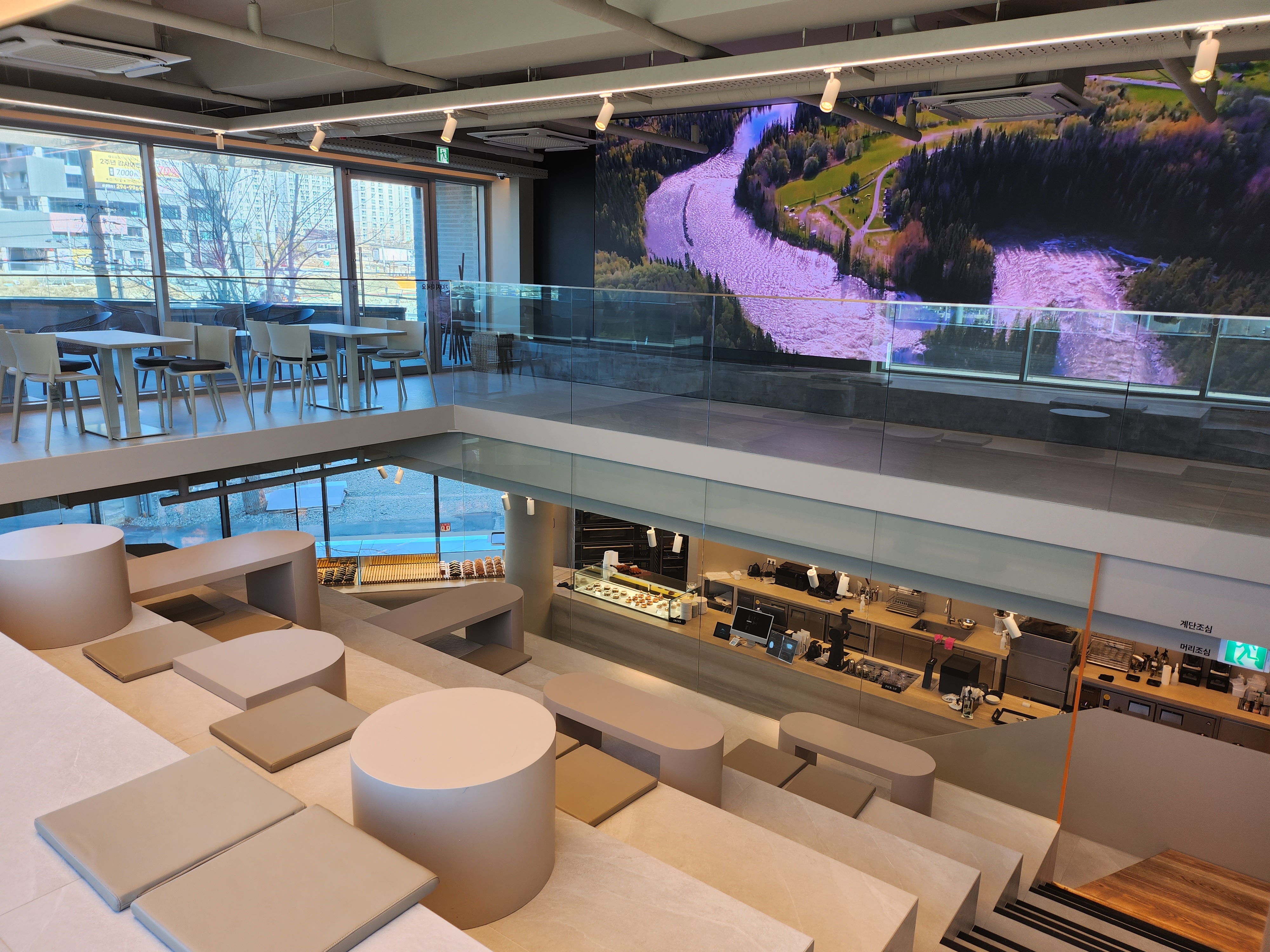 대형 LED 화면이 있는 멋진 카페라니...