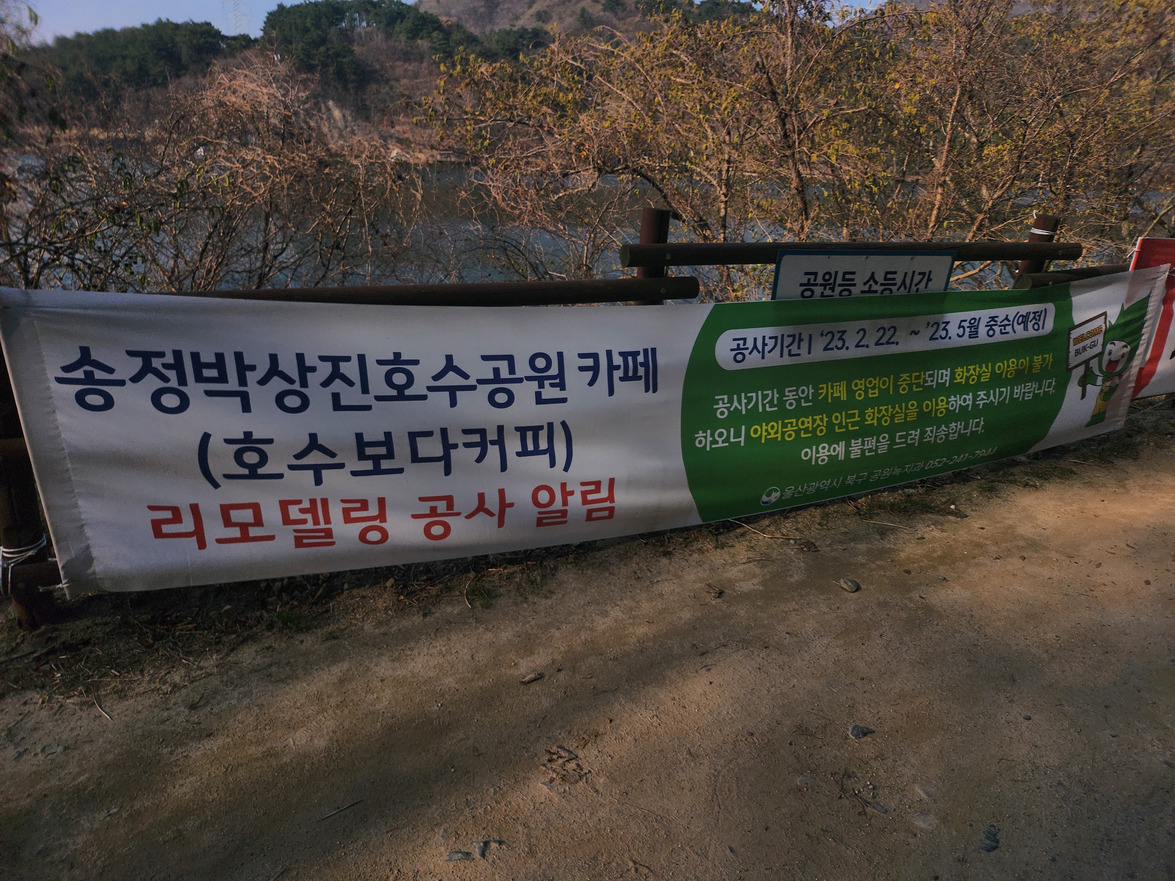 박상진 호수공원 카페 리모델링 공사 알림 표지가 있네요