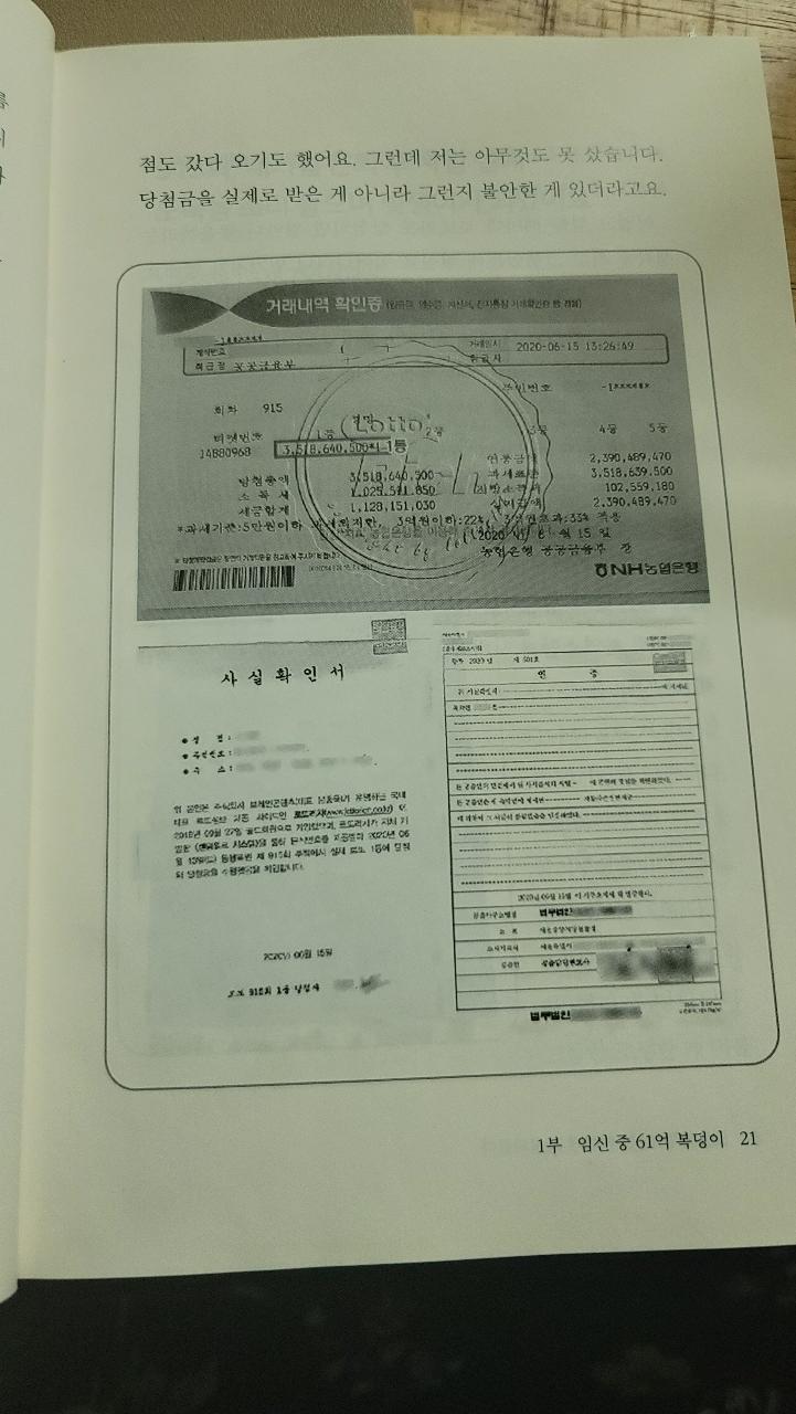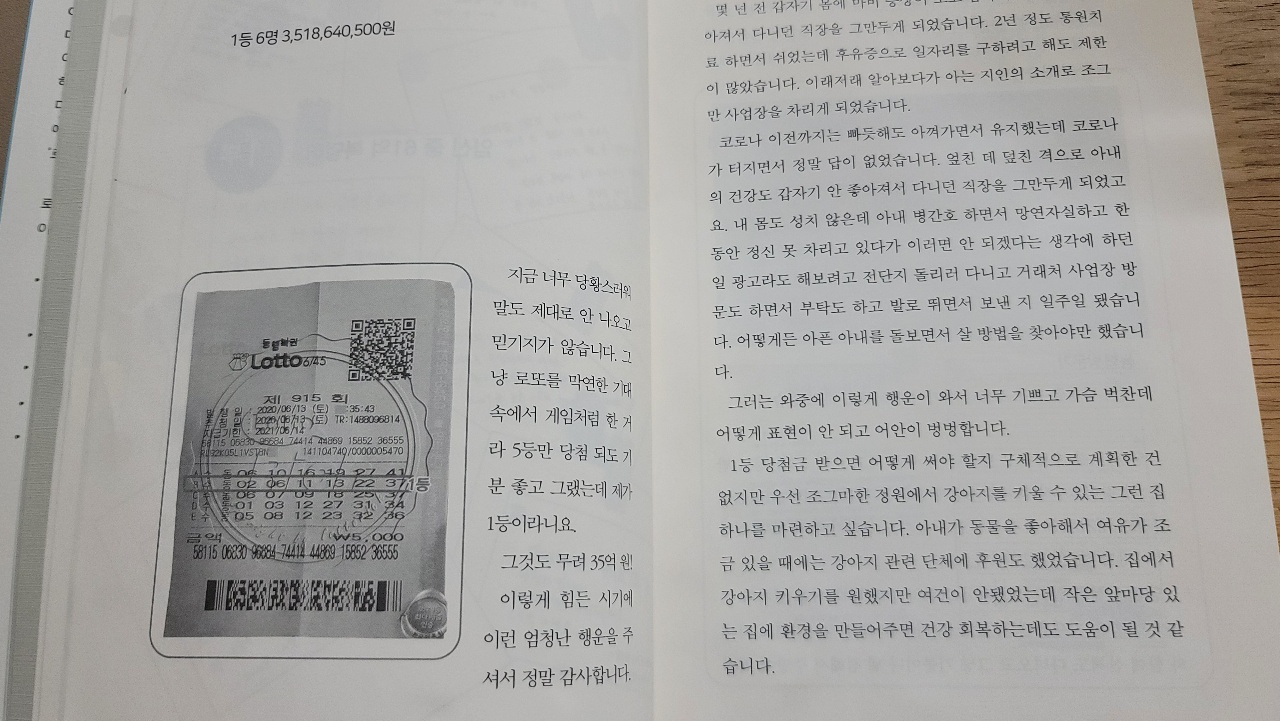 실제 로또 1등에 당첨된 로또 용지가 함께 첨부되어 있어서