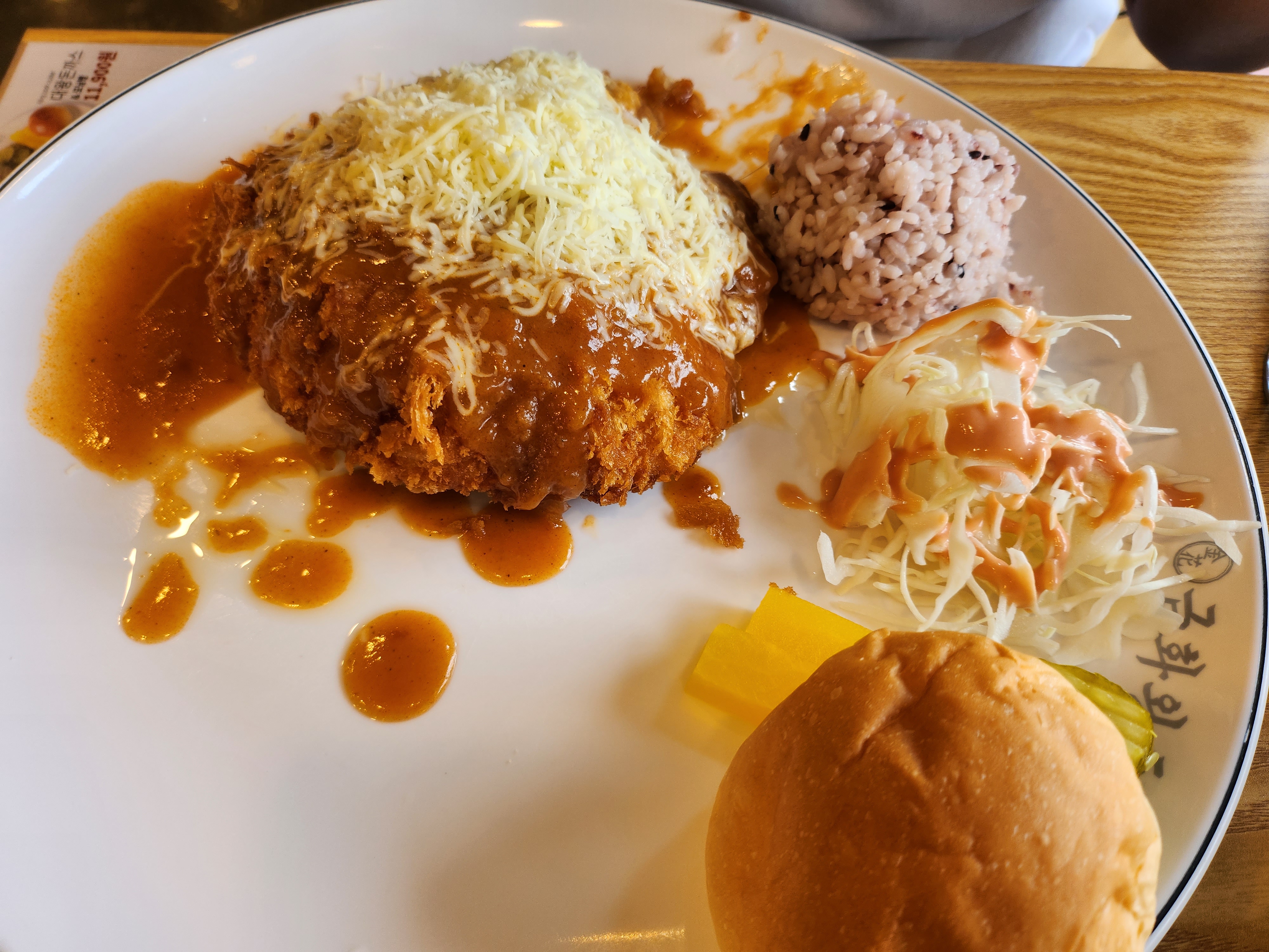 돈까스 위에 치즈가 눈꽃처럼 내려와 있어요