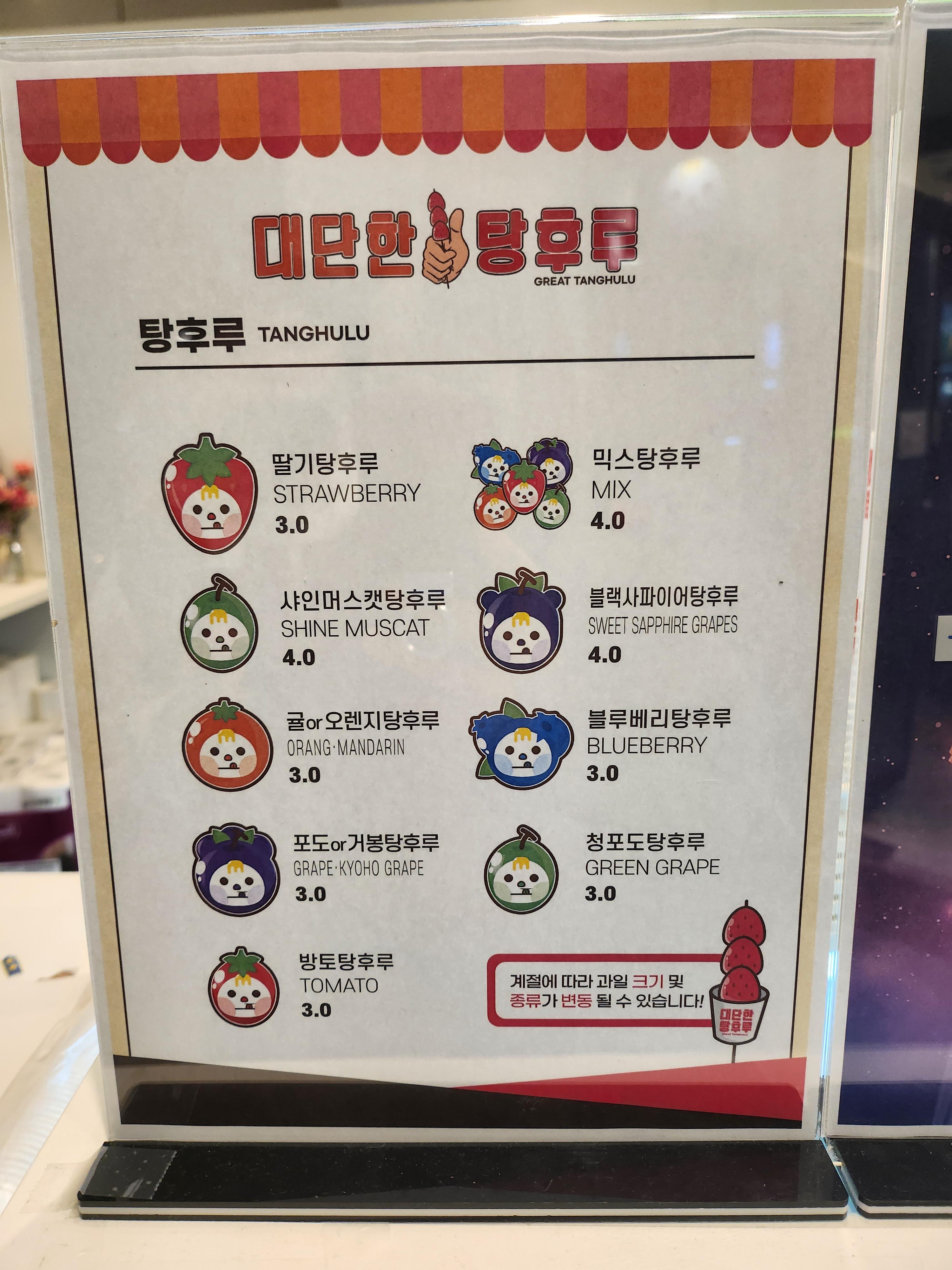 딸기탕후루, 샤인머스캣 탕후루, 귤&오렌지 탕후루, 포도&거봉 탕후루