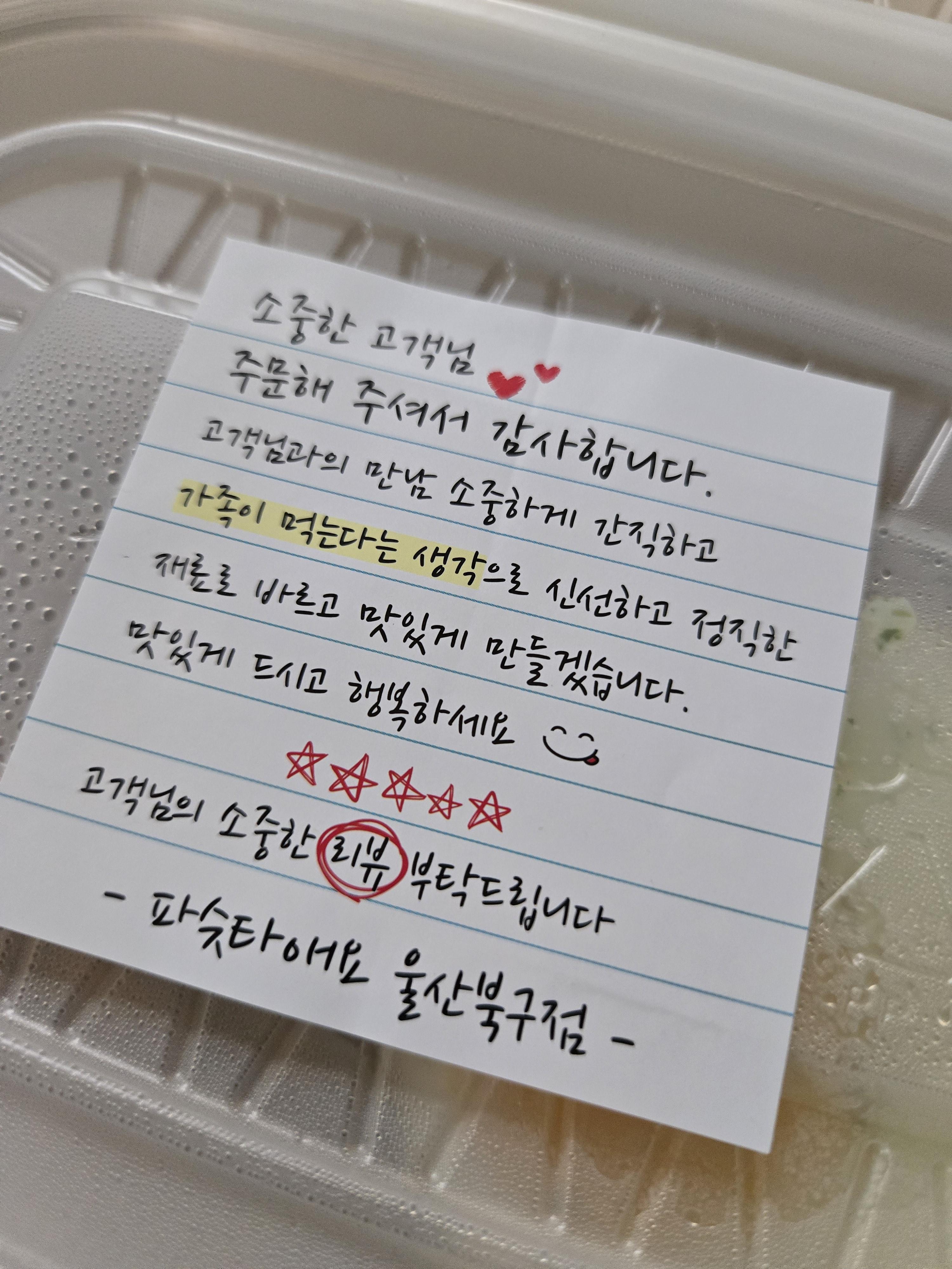 소중한 고객님께 메모까지 같이 오는 파슷타애요 울산북구점 입니다