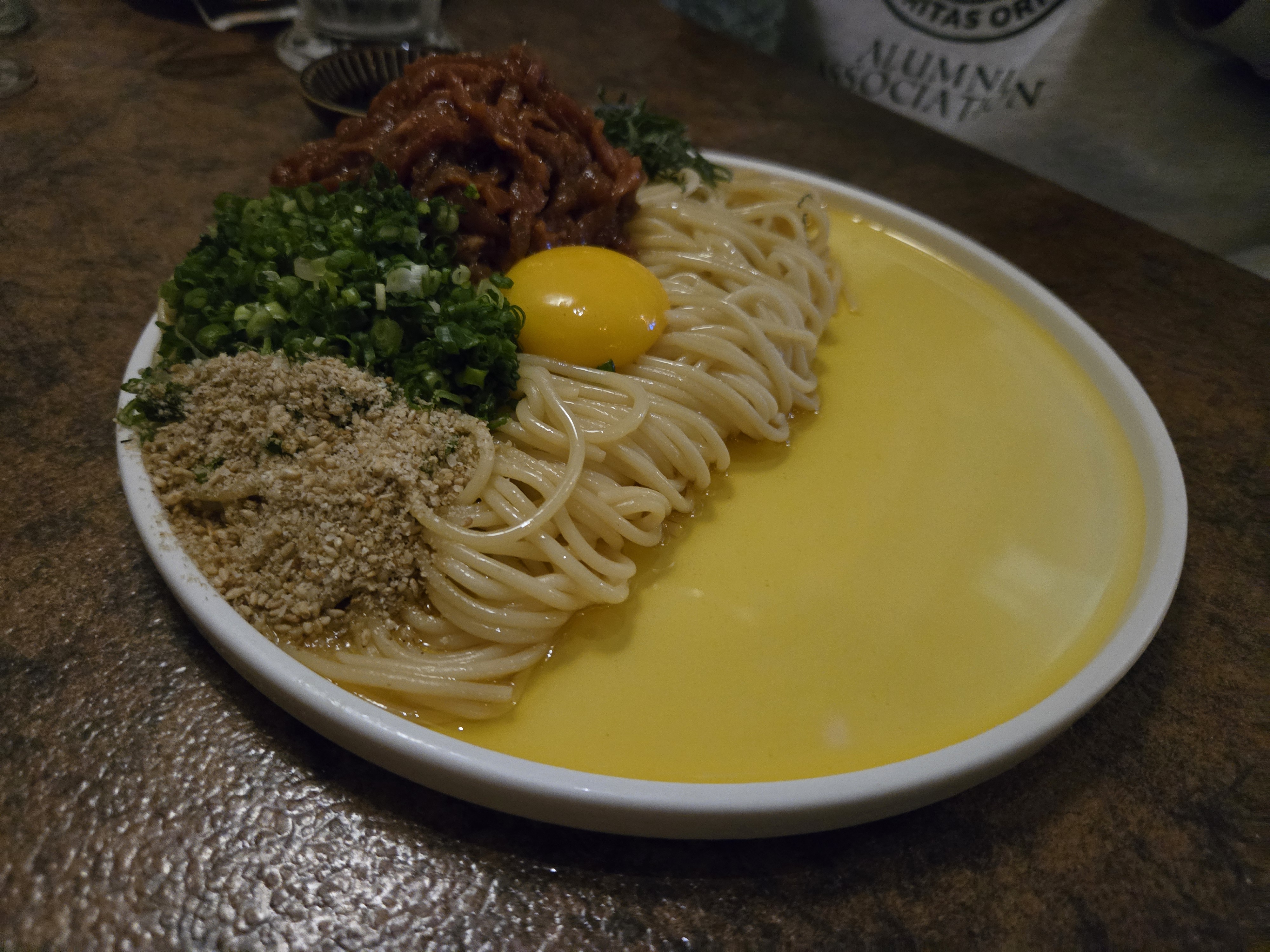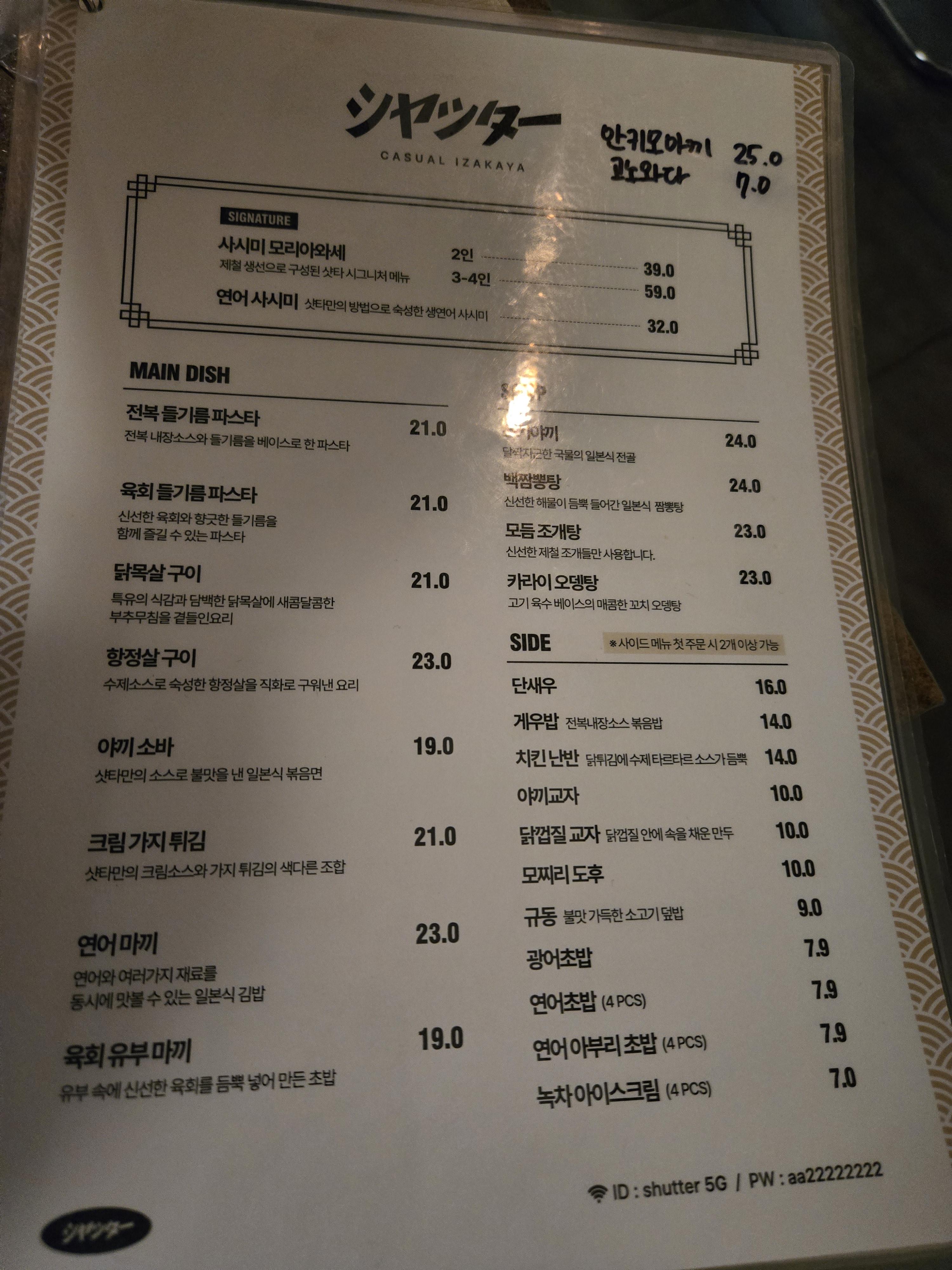 육회 들기름 파스타, 사시미 모리아와세, 연어 사시미, 전복 들기름 파스타,야끼 소바, 닭목살 구이, 항정살 구이