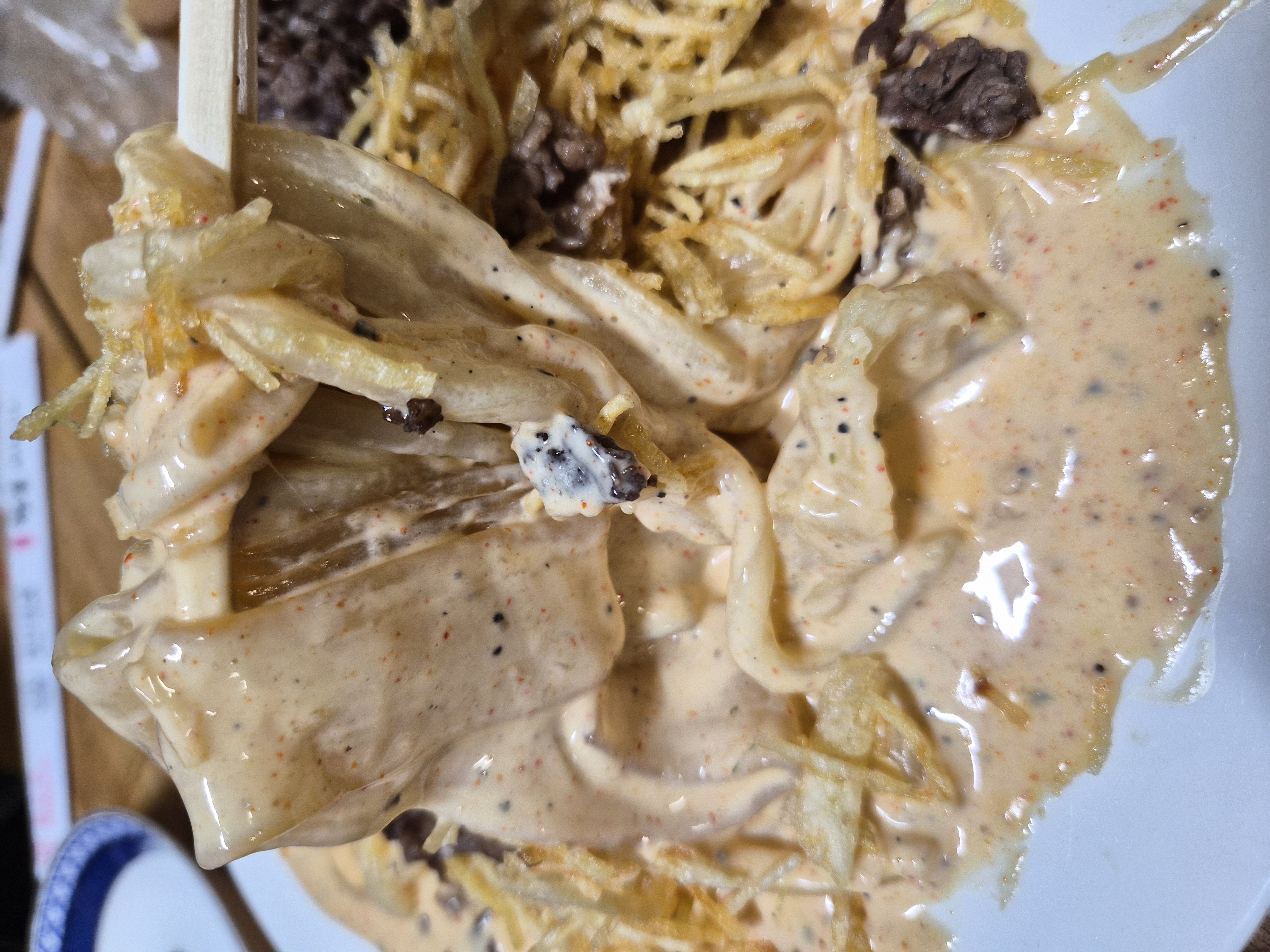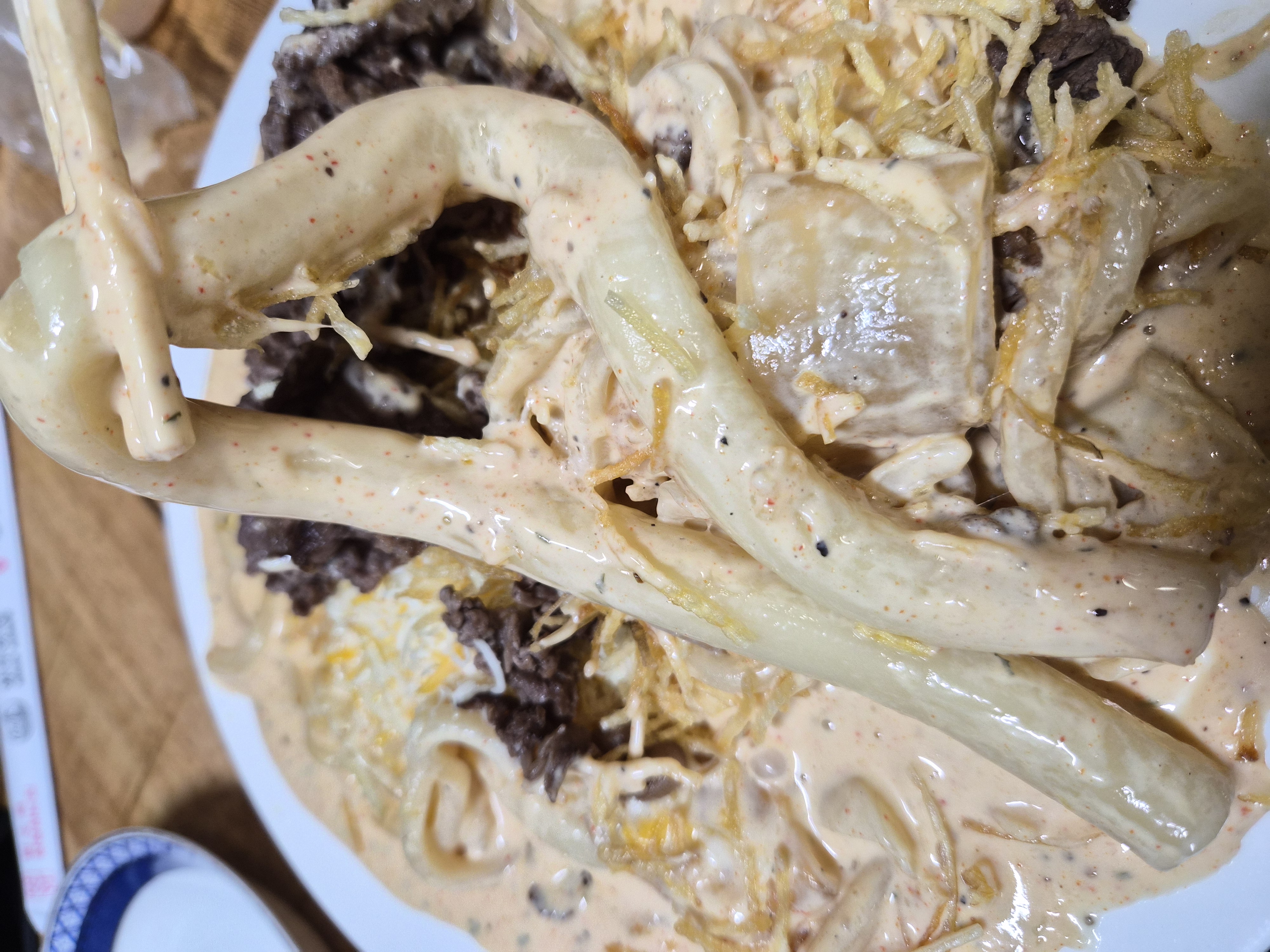 매콤한 크림에 치즈, 감자채, 차돌을 올린 풍미 가득 떡볶이 인데 !
